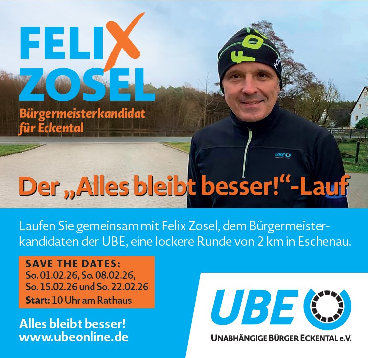 Terminübersicht: Kennenlernen des UBE-Bürgermeisterkandidaten Felix Zosel sowie den Kandidatinnen und Kandidaten in den OrtsteilenEinladung zum Blauen Sofa Gespräch mit UBE-Bürgermeisterkandidat Felix ZoselEinladung Laufen mit UBE-Bürgermeisterkandidat Felix Zosel